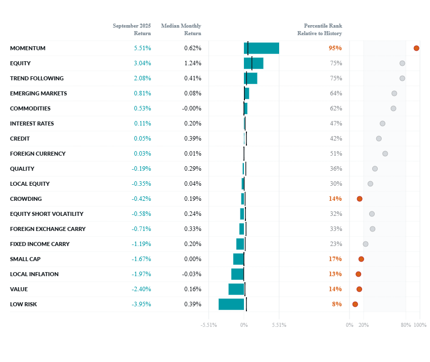 Source: Venn by Two Sigma. The median and percentile columns measure the performance of each factor in the Two Sigma Factor Lens relative to the entire history of the factor in USD, using monthly data for the period August 1998 - September 2025
