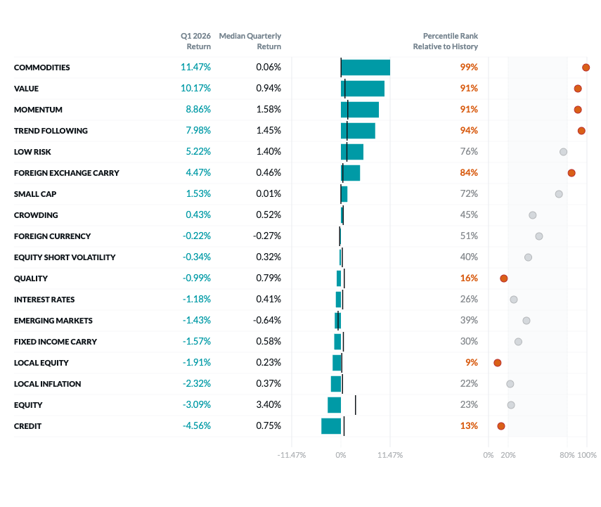 In this report, we highlight Q1 2026 factor performance that was in the top or bottom 20th percentile of each factor’s full history (Exhibit 1 in orange).