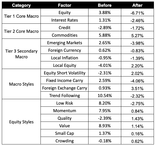 Macro Styles: This category aims to capture the typical institutional portfolio risks taken when seeking excess returns within the macro landscape. All macro styles exhibited meaningful movements between before and after periods.