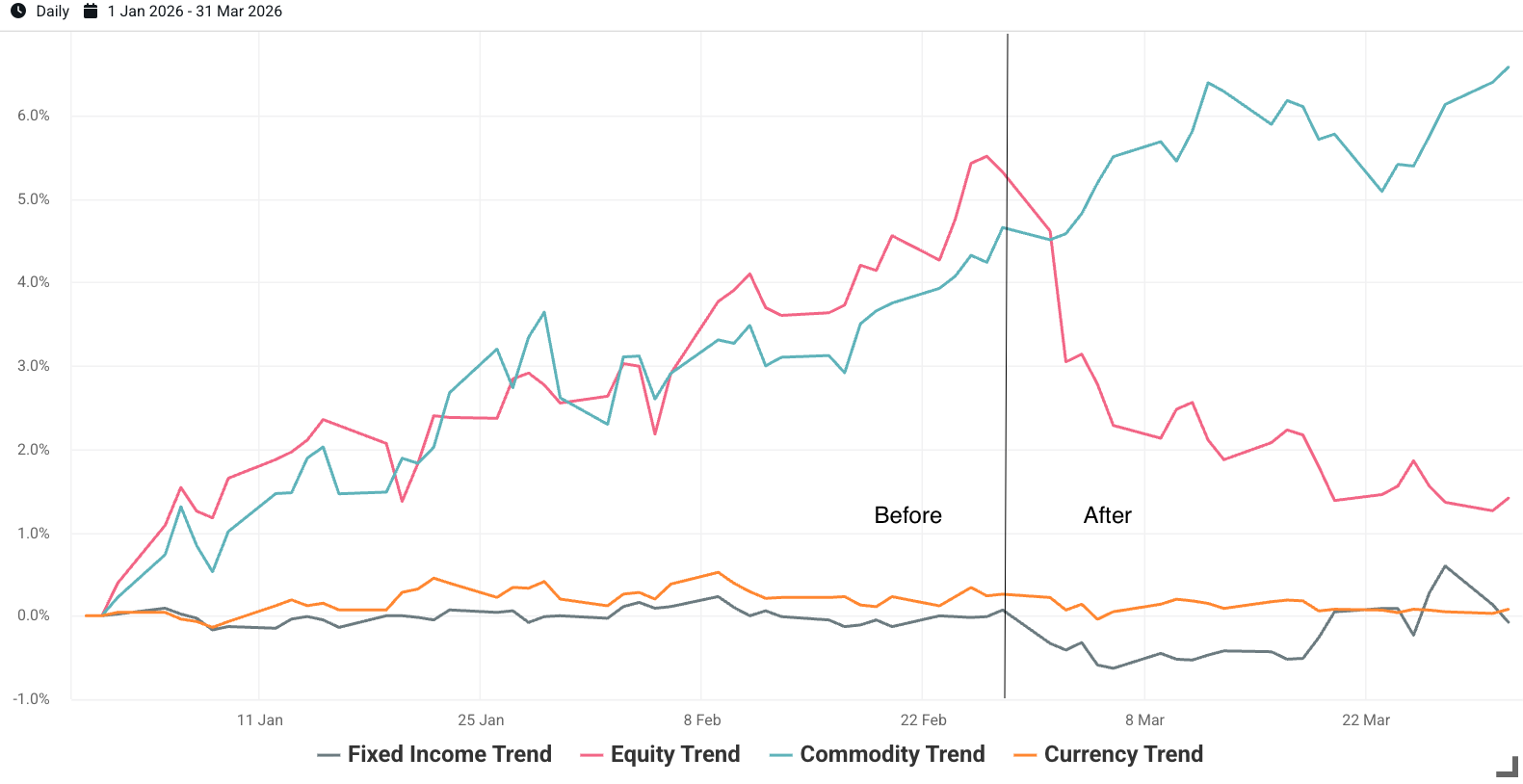 However, it’s clear that its positioning, informed by the six and twelve month period before the U.S. announcement, was sub-optimal for the “after” period, as it was down 2.32%. Examining sub-portfolio contributions, the commodities sleeve was the main driver of positive return. As we discussed earlier, commodities were performing well both before and after the U.S. military announcement, leading to a more successful trend strategy in this asset class in Q1. This sleeve helped to dampen the negative return from equity trend, which fell in the period after the announcement.