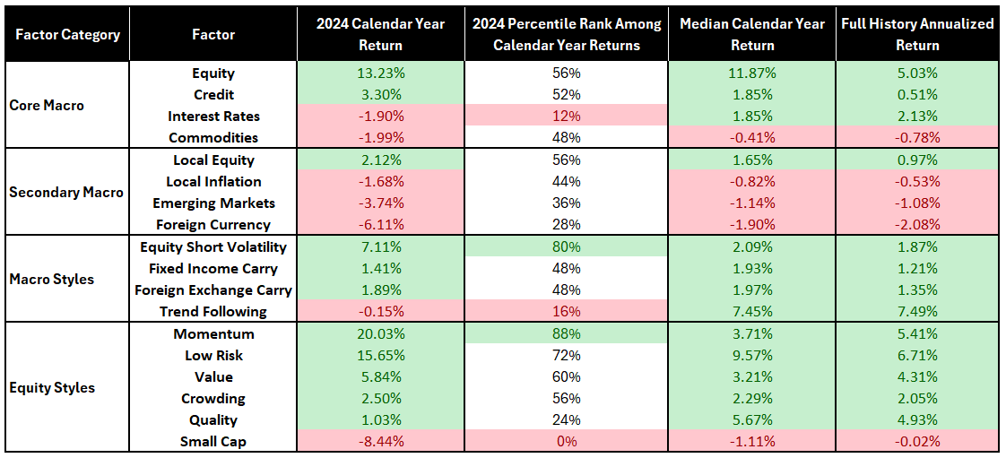 Core Macro Factors: Among Equity, Interest Rates, Credit, and Commodities factors, only the Interest Rates factor stood out in 2024, ranking in the bottom 12% of its calendar year returns.