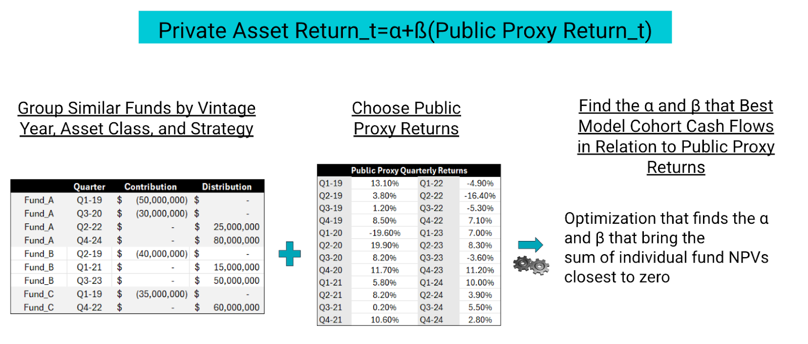 For each cohort, our methodology addresses a fundamental question: What relationship to public markets would make the present value of contributions (money in) equal the present value of distributions (money out)? To accomplish this, we find the β to a public proxy, and α, that brings the sum of individual fund net present values (NPV) closest to zero. We then apply these parameters to daily public proxy returns, as shown in Exhibit 2.