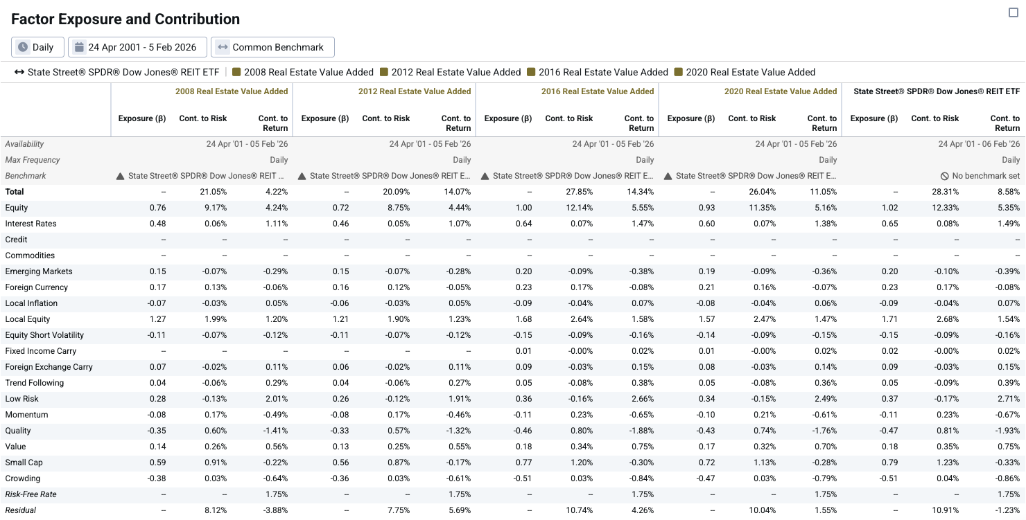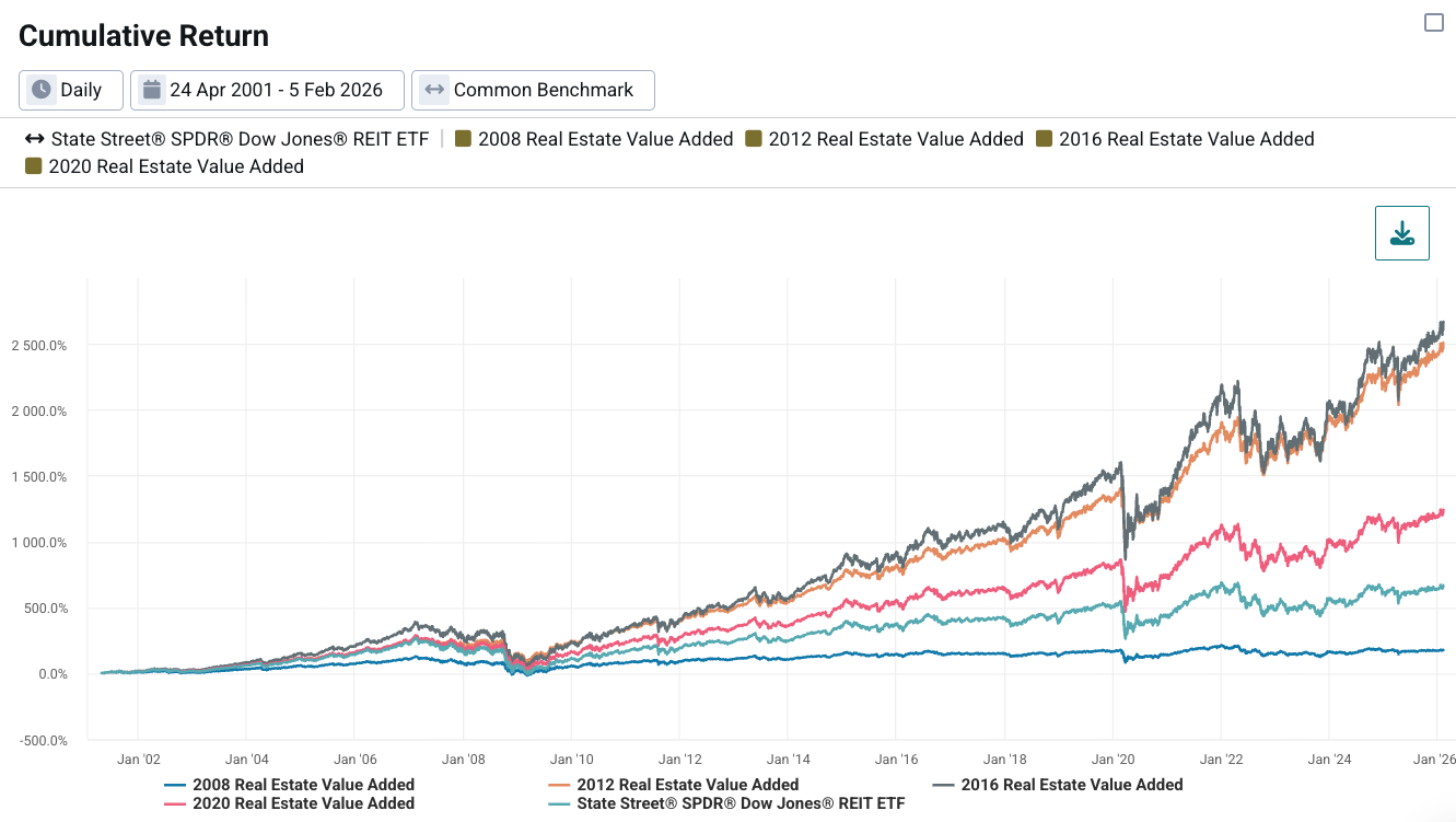 In Exhibit 3, we compare the 2008, 2012, 2016, and 2020 vintage cohort returns of “Real Estate Value Added” over a ~25-year period to the SPDR Dow Jones REIT ETF (RWR) benchmark. These cohort returns are derived by applying the cash flow-informed β and α to the full return history of the public proxy, generating modeled returns that exist throughout the entire analysis period.