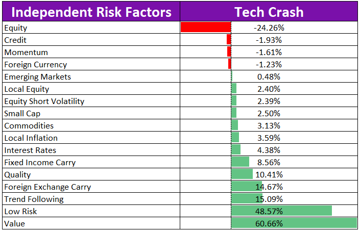 Momentum: One might expect that Momentum would ride Tech performance higher just to be holding the proverbial “bag”. During the Tech Crash, however, the Momentum factor declined by only an annualized 1.61%.