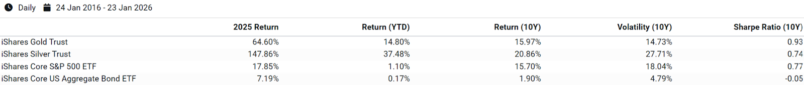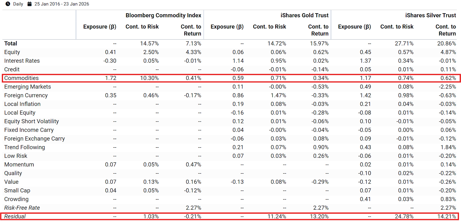 What makes these differences in factor output even more stark is that broad commodities exposure includes Gold and Silver allocations. For example, as of 12/31/2025, the commodity index we chose held 20.30% in Gold and 9.01% in Silver.5 This confirms that broad commodity exposure, inclusive of Gold and Silver, has produced an extremely different risk profile than Gold or Silver as standalone assets over the last decade.