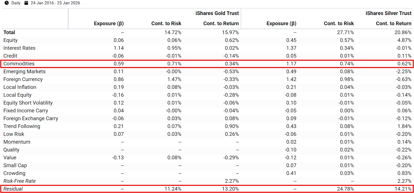 Most notably, our Commodities factor has contributed very little to the risk or return of either asset. This is likely surprising to some, and completely contradicts the asset-class classification of Gold and Silver. More on this in our next section.