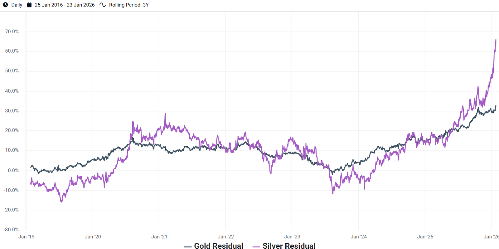 It is worth noting that the recent acceleration in residual return is significant for both Gold and Silver, and that allocators should be cautious about extrapolating recent performance. As always, past performance does not guarantee future results.