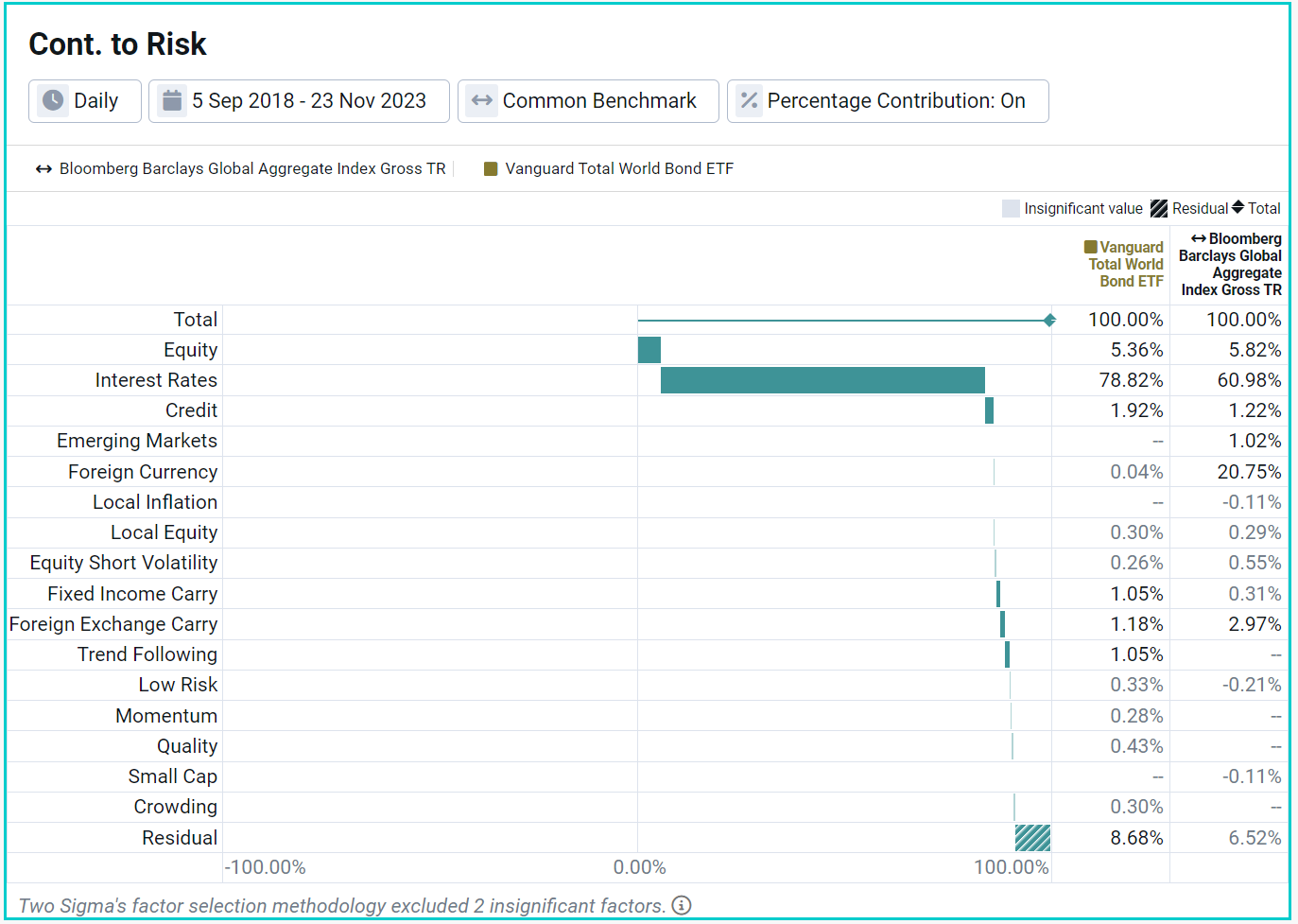 One noticeable difference is that Foreign Currency was not selected as a relevant factor for the bond manager via Venn’s factor selection process. On the other hand, the global benchmark populated a meaningful exposure of 0.35.
