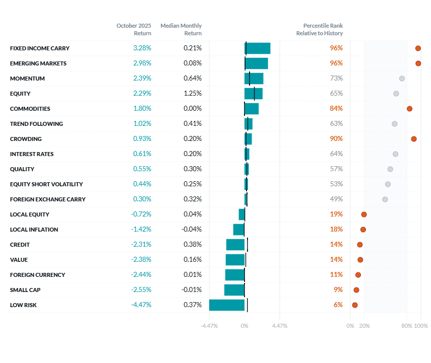 Emerging Markets: Designed to be decorrelated from higher‑tier macro factors, our Emerging Markets factor has historically not earned a persistent risk premium. October was quite the exception, with the factor rising 2.98%. The raw input consists of EM equities, debt, and currencies, of which the first two were positive.