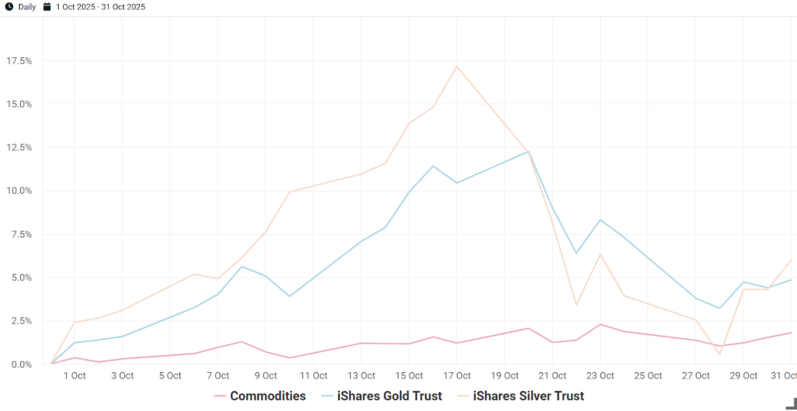 Commodities: Broad commodities benefited from strength in precious metals, though those assets lost much of their gains late in the month. Gold and Silver, which were approximately 19% and 6% of our Commodities factor’s raw input at the start of October, rose 4.85% and 5.99%, respectively. Demand drivers included their perceived roles as safe‑haven and inflation‑hedging assets, expectations for U.S. rate cuts, and continued central‑bank buying.