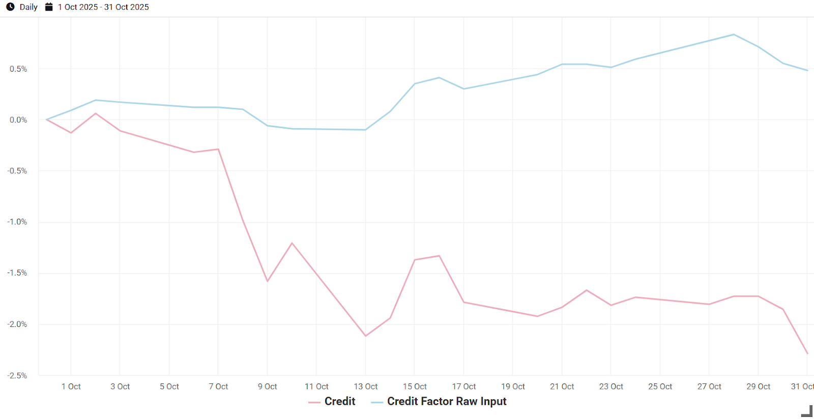 Credit: The raw input of our Credit factor was positive in October, returning 0.48%. However, after removing overlapping risk with our Equity and Interest Rates factors the factor turned deeply negative. Using our tier system, this suggests investors with credit exposure may have been compensated more for equity and rates beta than for exposure to corporate default risk. For portfolios seeking purer credit risk exposure, a factor‑aware, decorrelated approach may be critical to separate these exposures and clearly understand risk and return drivers.