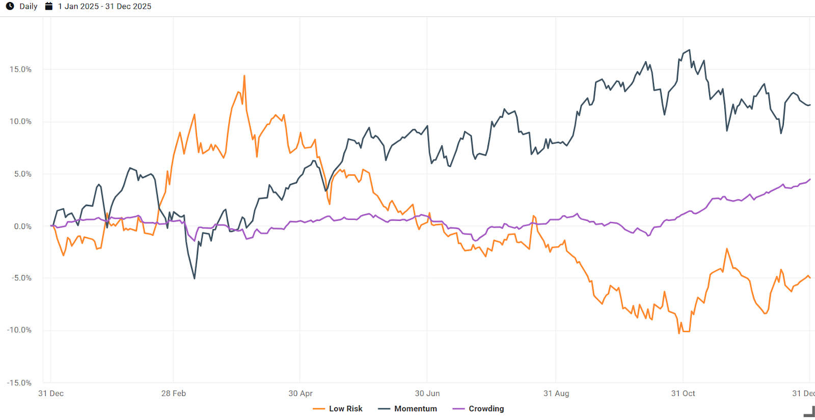 This factor's performance captured inflation dynamics beyond our core macro factors throughout the year. In the first half, tariff fears elevated pure inflation expectations, and an inflation hedge added value, so the factor was volatile but generally positive.
