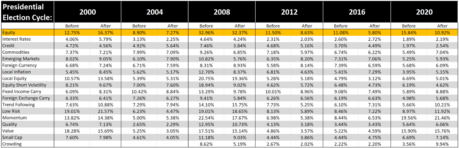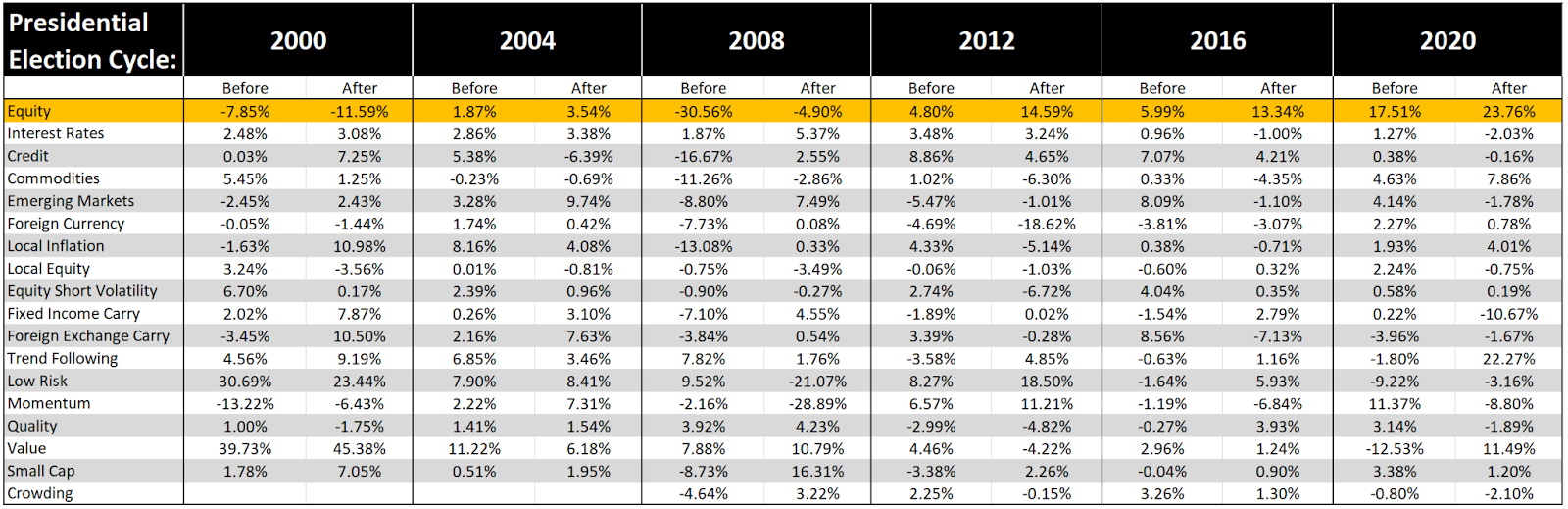 Acknowledging the importance of market context to interpret this data, we see the 2000 election does stand out. Similar to 2008, this election happened during a recession. With that in mind, the 2000 election was a case where pre-election Equity factor returns were higher rather than afterwards.