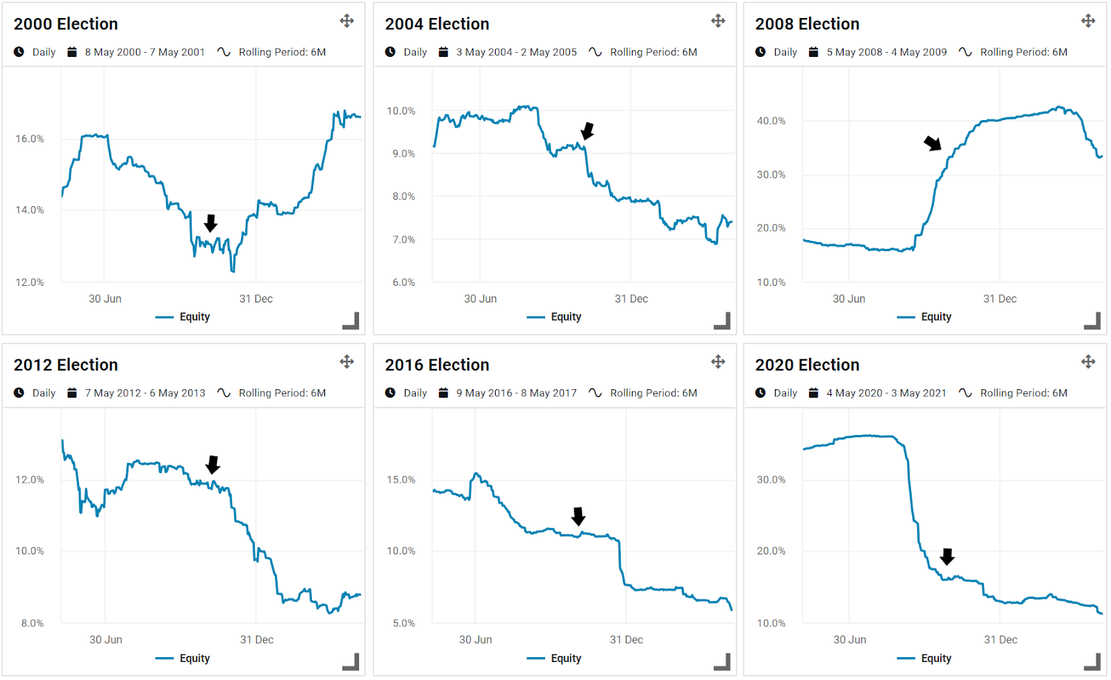 To understand volatility around recent presidential elections further, we used Venn’s Report Lab.3 Exhibit 3 illustrates rolling six-month volatility for the year surrounding each election, encapsulating both the six months before and after. This means that the midpoint area represents Election Day (the black arrow).