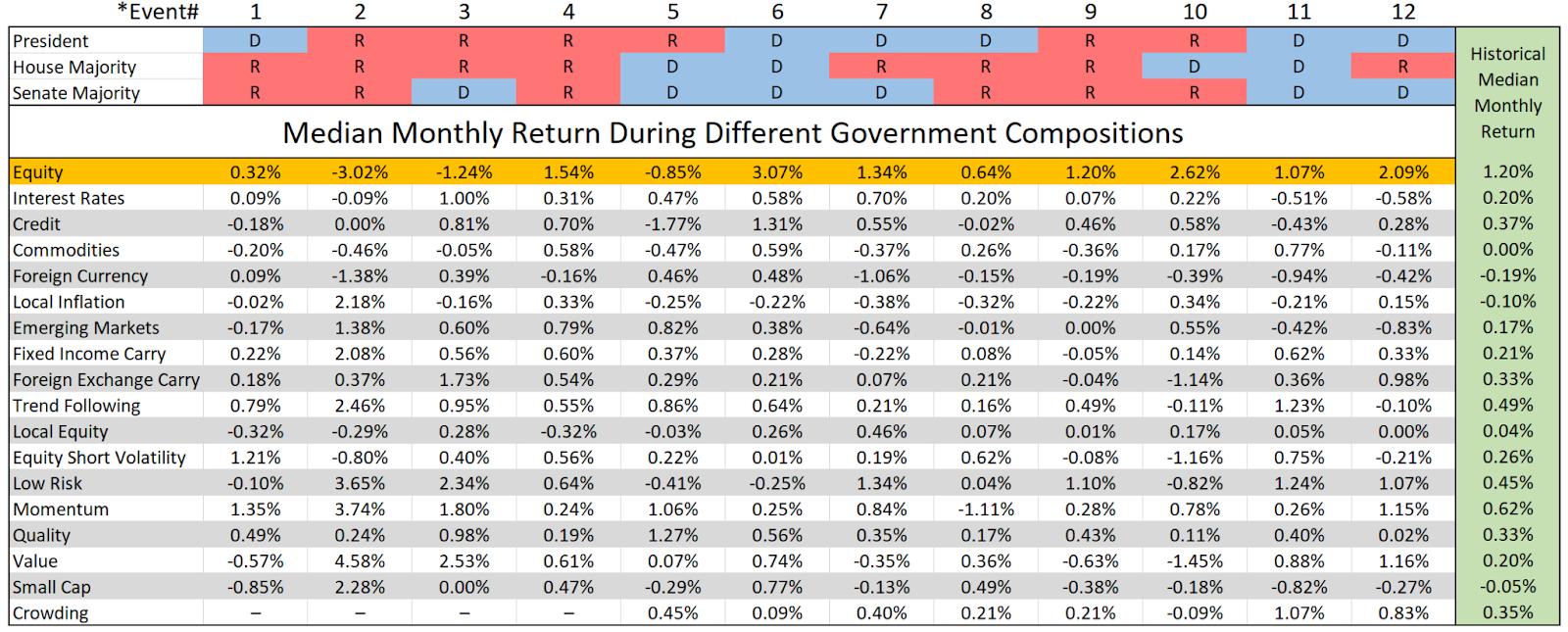 5 We decided to use median monthly returns for simplicity and to align with our factor performance report. However, transitions between political parties often don’t happen cleanly at month end. Given this, and that the intention of this exercise was not to capture initial market reaction to party changes but rather a more stable understanding of returns over that government composition, we excluded all months when the transition actually takes place. For example, January 2001 is excluded from median monthly return calculations since Bush became president on 1/20/2001.