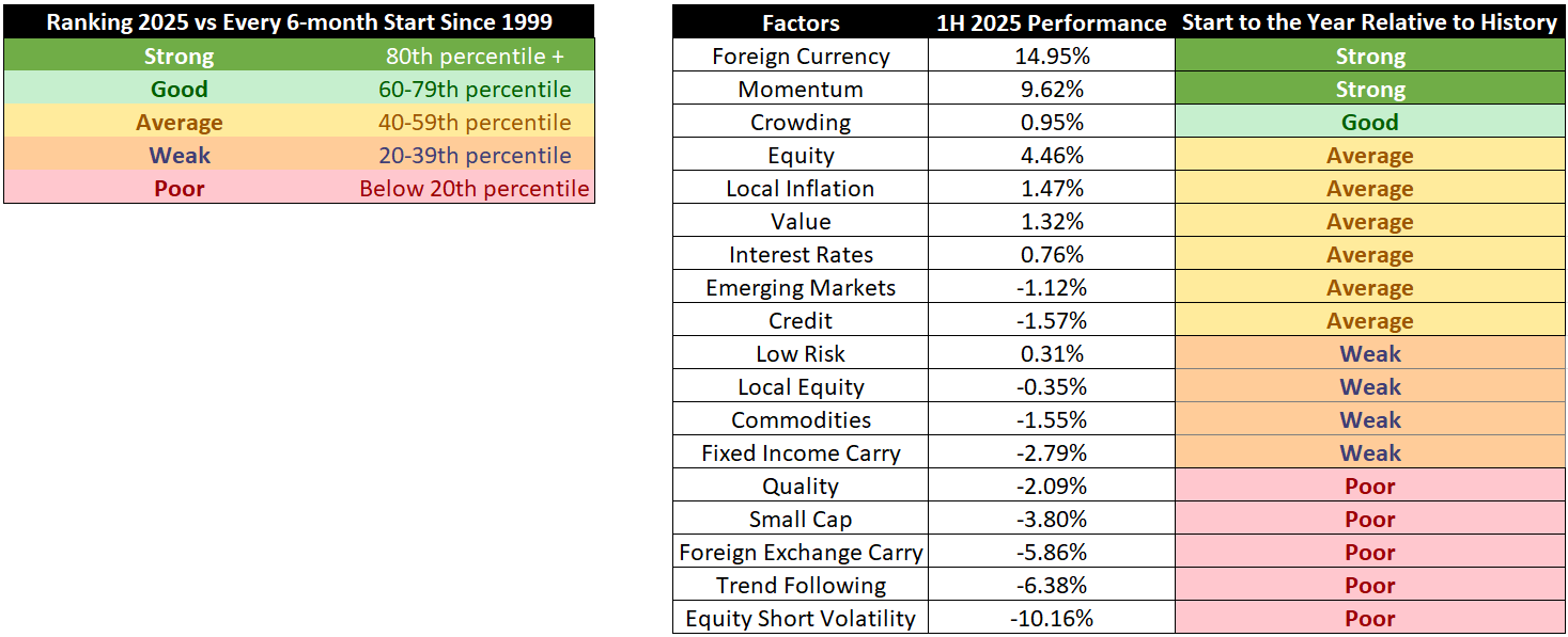 Poor Starts: Five style factors experienced historically poor 1H performance, with Equity Short Volatility posting its worst 1H on record. Style factors are designed to capture systematic risk exposures that institutional investors utilize for enhanced returns, meaning investors with positive exposure to these factors achieved an unwelcome result in 2025.