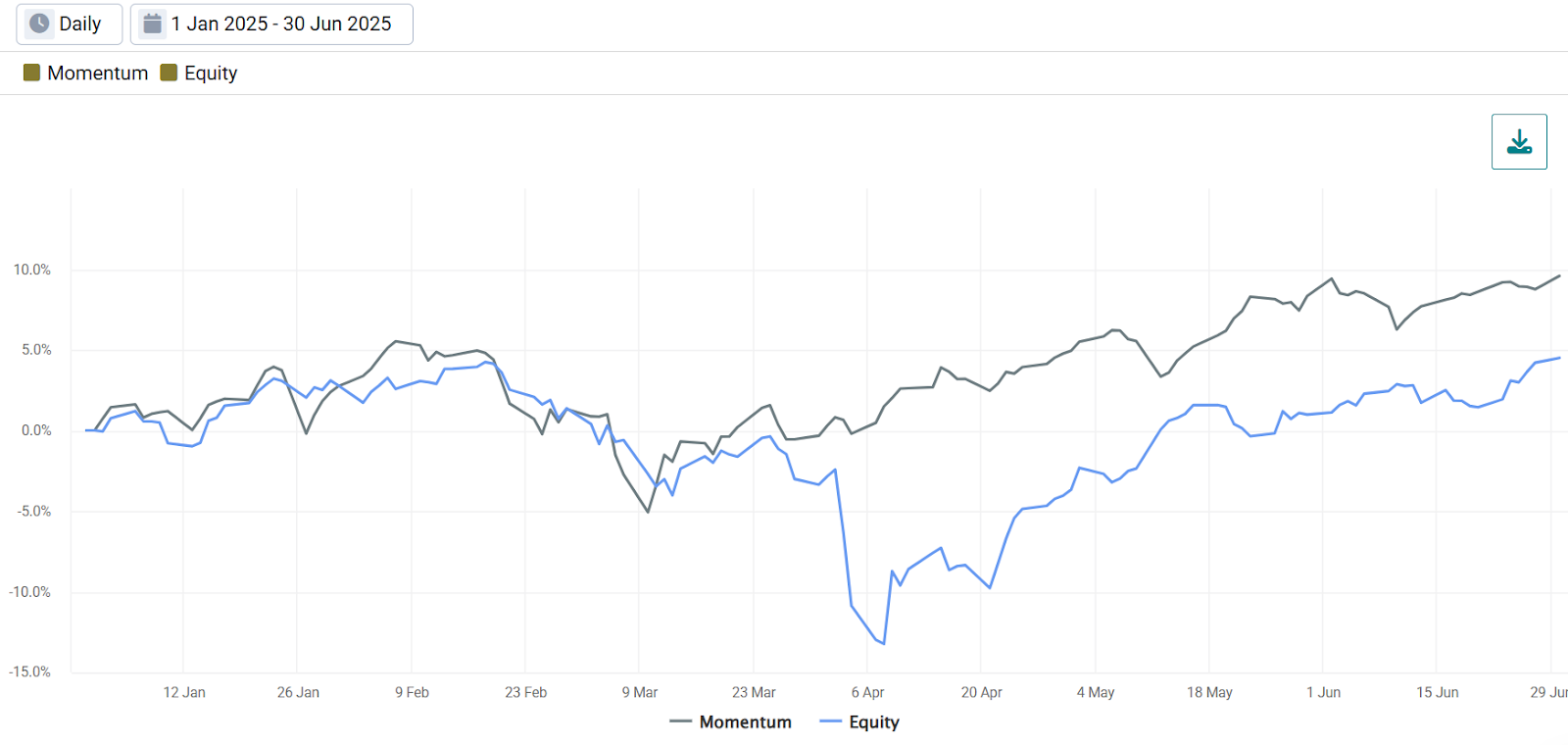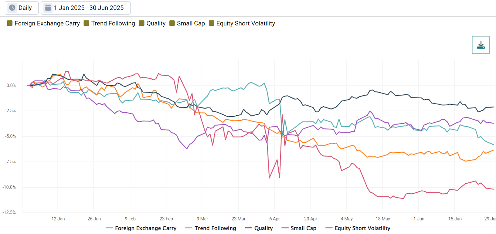 This illustrates an important distinction: while tariffs drove broad equity declines, they simultaneously accelerated relative performance trends within equity markets. This shows how macro shocks can have opposing effects at different levels of the investment landscape.