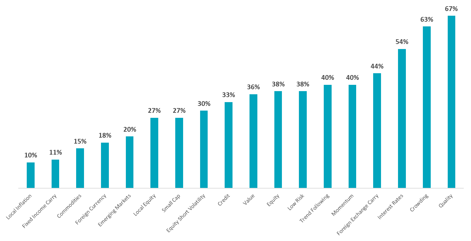 6We would consider Fixed Income Carry, Equity Short Volatility, Credit, Value, Equity, Low Risk, Trend Following, Momentum, Foreign Exchange Carry, Interest Rates, Crowding, and Quality to be in this category. Fixed Income Carry is an exception to this insight which we discuss later.