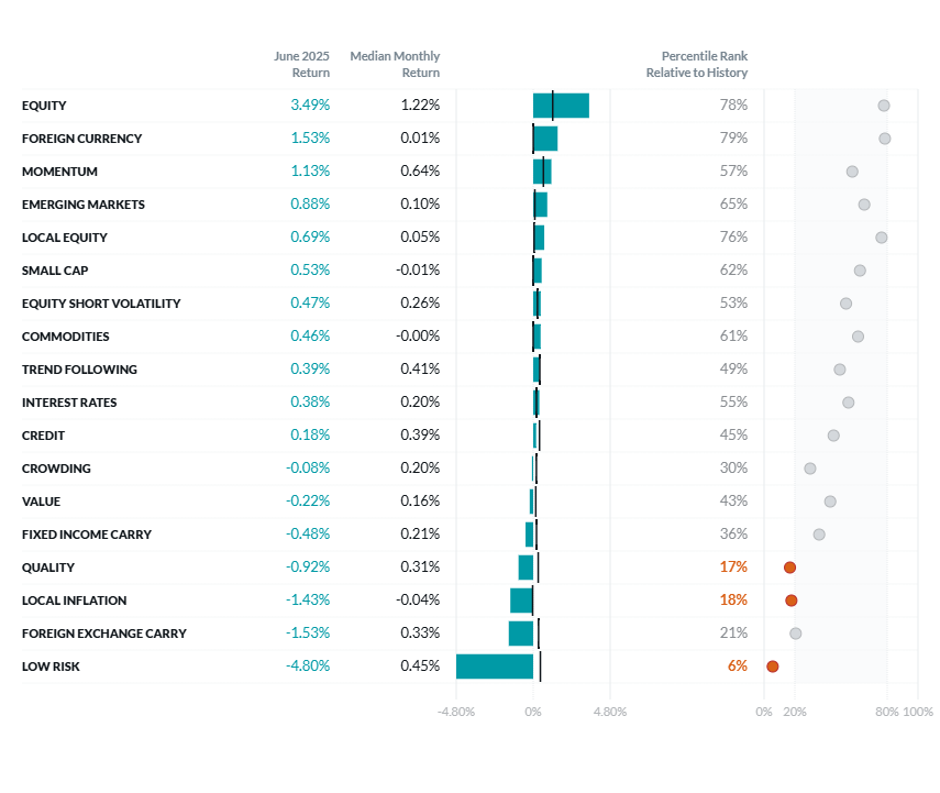 Source: Venn by Two Sigma. The median and percentile columns measure the performance of each factor in the Two Sigma Factor Lens relative to the entire history of the factor in USD, using monthly data for the period August 1998 - June 2025.