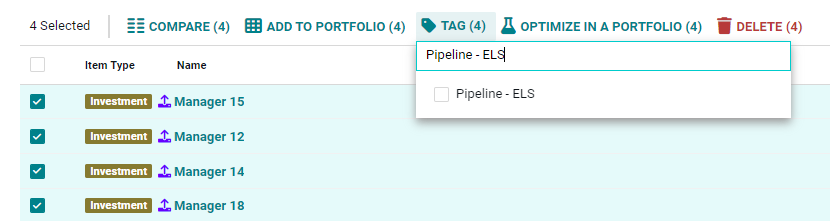 After uploading return streams or locating investments already on Venn’s Data Library, you can categorize them by applying a “Tag.” You can use this feature to label “Pipeline” investments that you’re currently performing diligence on, making it easier to access these tagged investments on the Library and perform additional analysis. Similarly, you can tag others as “Watch List” investments, perhaps due to poor performance, or simply use Tagging to better categorize all your uploads into their appropriate asset classes/strategies.